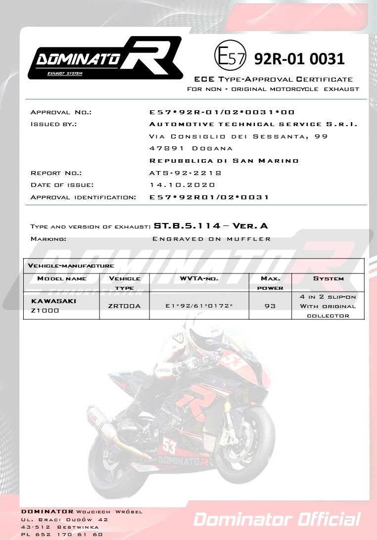 Homologated Sport Silencers DOMINATOR Slip-on for KAWASAKI Z 1000 (ZRT00A)