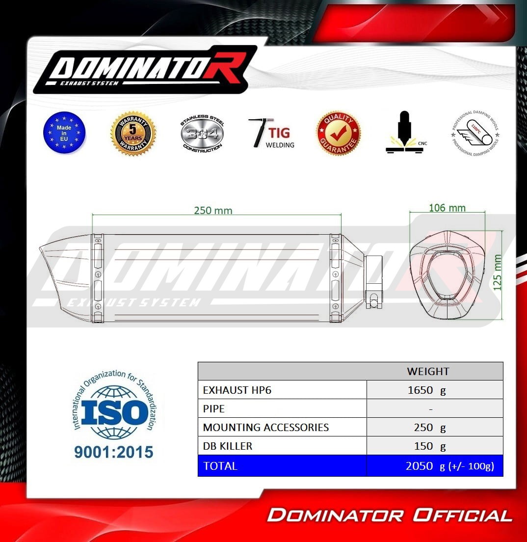 Sistema de escape Dominator cambiará el carácter de su motocicleta dándole un sonido único. El sistema de escape a través aumentará la potencia y el par del motor, mientras que reduce el peso del silenciador.