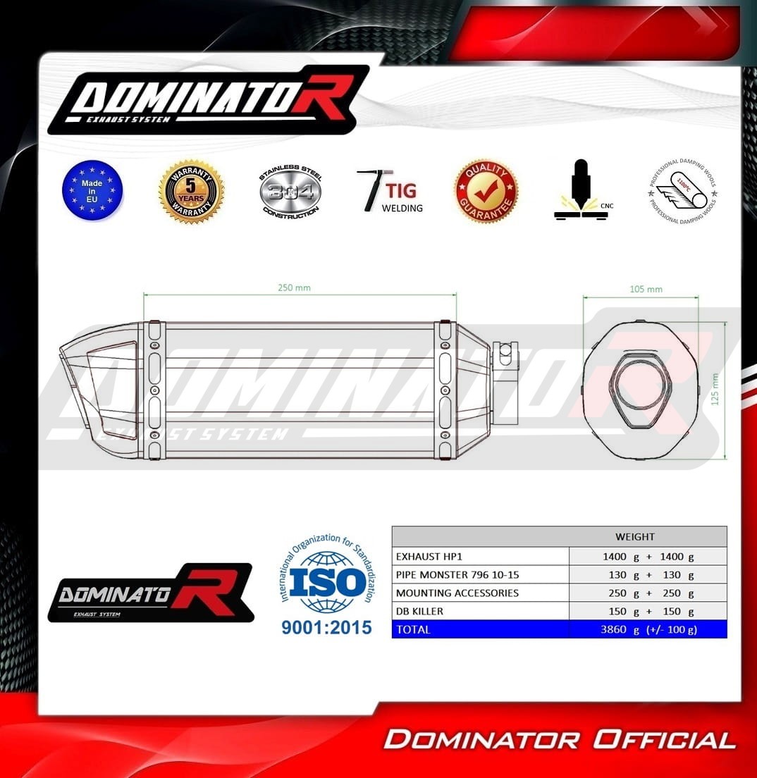 Sistema de escape Dominator cambiará el carácter de su motocicleta dándole un sonido único. El sistema de escape a través aumentará la potencia y el par del motor, mientras que reduce el peso del silenciador.
