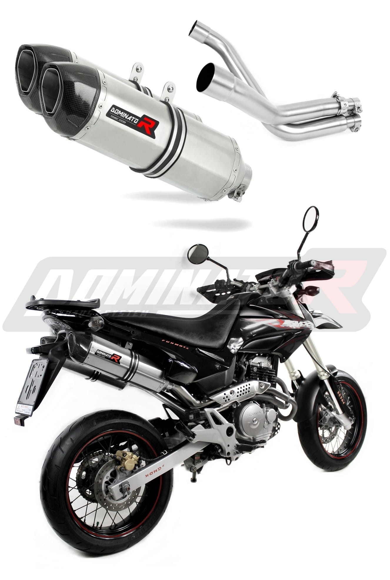 Sistema de escape Dominator cambiará el carácter de su motocicleta dándole un sonido único. El sistema de escape a través aumentará la potencia y el par del motor, mientras que reduce el peso del silenciador.
